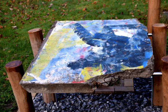Aufgebahrt und gesichert hat das Ehepaar Bone das Stück Mauer dann auf einem Gestell aus Edelstahl und Robinienholz. Passend dazu wurde daneben eine Informationstafel über die Geschichte der Berliner Mauer, ebenfalls mit Robinienholz gerahmt, aufgestellt. In der Natur des Dämmerwaldes recht auffällig und ein echter Hingucker.