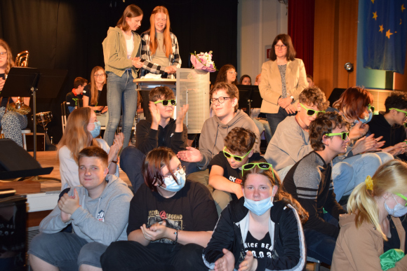Maria Triptrap und Paula Humbeil, Schülerinnen der 9e erzählten, dass sie als Bläserklasse schon in der Fünf ihre Klassengemeinschaft durch verschiedene Aktionen gestärkt haben. Dazu zählte dann auch die Teilnahme am Klassenwettbewerb „Be Smart- Don`t Start“. Aber: “Unsere Teilnahme als Klassengemeinschaft wurde von Jahr zu Jahr schwieriger“, gaben sie zu und bedankten sich bei Ellen Oberkinkhaus für die stete Motivation. Und natürlich freuten sie sich über den Preis, von dem auch Schulleiter Norbert Hohmann vor zwei Wochen überrascht wurde. Ausgegeben wird es für die Klassenfahrt nach Berlin, für eine Kanutour und für den 10er Abschluss im, nächsten Jahr.