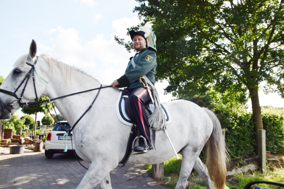 Die Zusammenstellung des Thrones brachte den Vorstand am frühen Samstagabend dann doch ein wenig ins Schwitzen. Während Oberleutnant Christoph Pannebäcker auf dem Pferd los ritt, um die designierte Königin über ihren zukünftigen Adelsstand zu informieren, wurden im Vorstand die Köpfe zusammengesteckt, um Ersatz für die Ämter der Thronherren zu finden.Denn der König bekleidet das Amt des Unteroffiziers, Kleinoeder ist Vizefeldwebel und Terstegen Leutnant. Aber auch diese Situation konnte die Freude darüber, dass nach drei Jahren ein neuer König gefunden war, nicht bremsen. Nach der offiziellen Vorstellung am frühen Abend im Zelt, hörte es sich an, als wollten die Anwesenden noch vor der Krönung vor Begeisterung das Zelt auseinandernehmen. Das Jugendblasorchester Drevenack verstand es, die Stimmung mit passender Musik ordentlich anzufeuern.