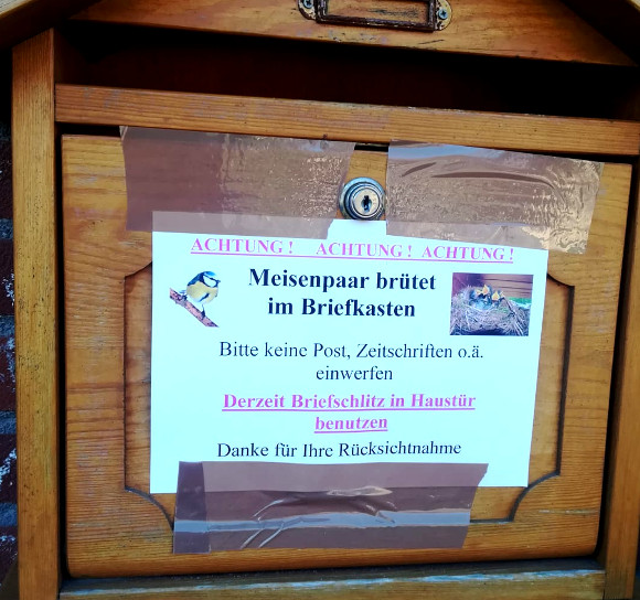 Das ist also, wie gesagt, nach 2013 (oder 2014) und 2016 nun der dritte Einzug aus der Tierwelt in den im Alpenlook aus Holz gebauten Briefkasten. Und in dieser Corona-Zeit bietet der Standort eine mehr als ruhige Unterkunft, denn im Gegensatz zu den vorherigen Malen ist kein reger, störender Besuchsverkehr direkt am Hauseingang zu erwarten. Auch ungebetene Interessenten wie Katzen oder Elstern haben bei der Ausstattung des „Hauses“ keine Chancen. Ebenso ist vor unerwünschtem Briefeinwurf, Werbung u. ä. mittels großer Aufkleber gewarnt..