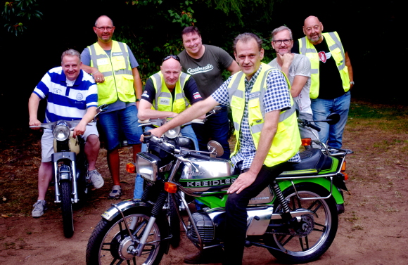 Bei der Frage worin denn der Reiz des Mopeds liegt, fangen die Augen der am Gespräch teilnehmenden Herren gleich an zu strahlen und Enthusiasmus kommt auf. „Die neuen und größeren Maschinen haben keine Seele“, heißt es und dass das Fahrgefühl nach jedem Start anders sei, und vor allem: „Die zickt noch rum“. Die Männer erzählen davon, mitunter auf dem Bauch auf der Maschine zu liegen, um noch einen Kilometer mehr an Geschwindigkeit aus dem Motor herauszuholen. Sie erzählen von begeisterten Reaktionen der Teilnehmer am Straßenverkehr wenn sie an der Ampel stehen, von Erzählungen die ihnen von Passanten beim Betrachten der Maschinen zugetragen werden, und, und und. Und, dass so ein Moped auch Einfluss auf das Körpergewicht nehme. Carsten Weidner lacht als er erzählt,: „Die hat nur knapp 7 PS, da geht nix, wenn du ein Schwergewicht bist“. Deswegen habe man in Jugendzeiten auch auf das Gewicht einer möglichen Freundin gucken müssen, fügt jemand aus dem Kreis scherzend an.