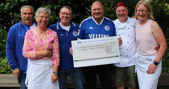12.6.2024 Schermbeck. Fröhliches Miteinander und leckeres Essen – beim Verwöhnma(h)l der Schermbecker Kirchengemeinden waren dieses Mal königsblaue Ehrengäste eingeladen. Der Vorstand des Schermbecker FC Schalke Fan-Clubs überreichte offiziell einen Scheck über 419,04€, Teil des sogenannten „Zeckengeldes“, an das Team der gemeinnützigen Veranstaltung, welches für die knapp 50 Gäste ordentlich auftischte.