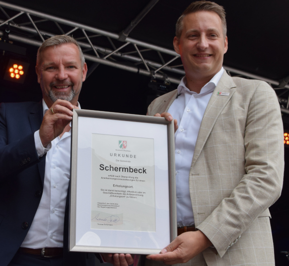 Am Sonntag, 7. Juli, wurde mir als Bürgermeister der Gemeinde Schermbeck die Urkunde von Regierungspräsident Thomas Schürmann überreicht. Schermbeck ist staatlich anerkannter Erholungsort! Deutschlandweit werben Kommunen, Gaststätten und Hotels regional und überregional mit diesem Prädikat für sich. Das wird künftig auch in Schermbeck möglich sein bzw. der örtlichen Gastronomie, der lokalen Wirtschaft und auch den vielen Vereinen.