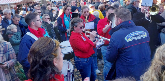 Der Höhepunkt des Tages war der anschließende Besuch des Kappesmarktes, wo die Mölledweilers ein Ständchen vor der Bühne gaben. Es war ein freudiges Wiedersehen mit alten Bekannten, denn insbesondere zwischen den Karnevalsvereinen aus Wehl und Raesfeld, die sich seit Jahren gegenseitig besuchen, wird die Freundschaft zwischen den beiden Orten gelebt.